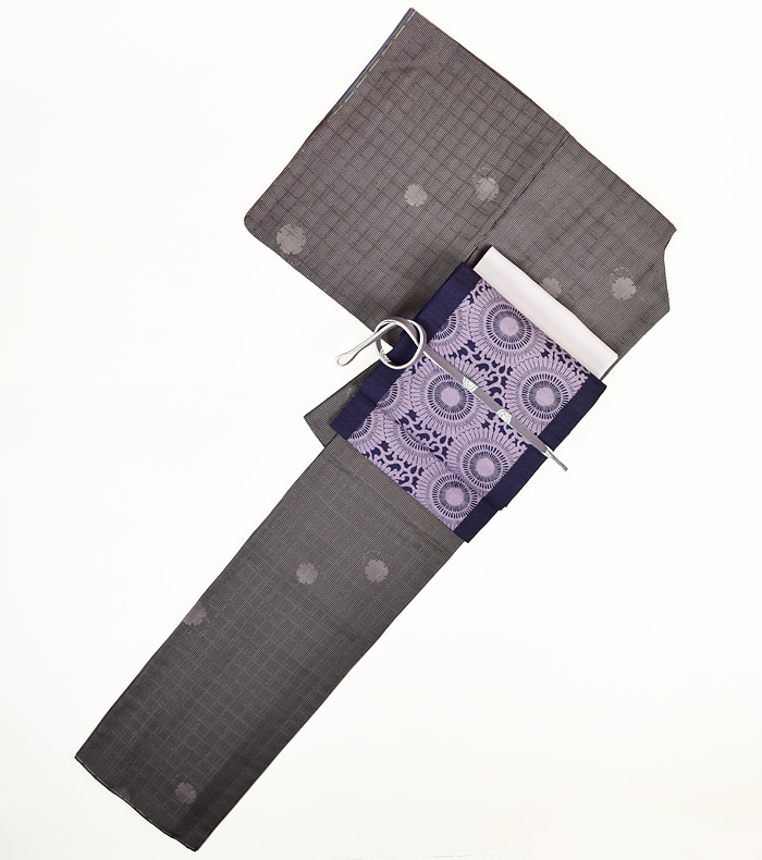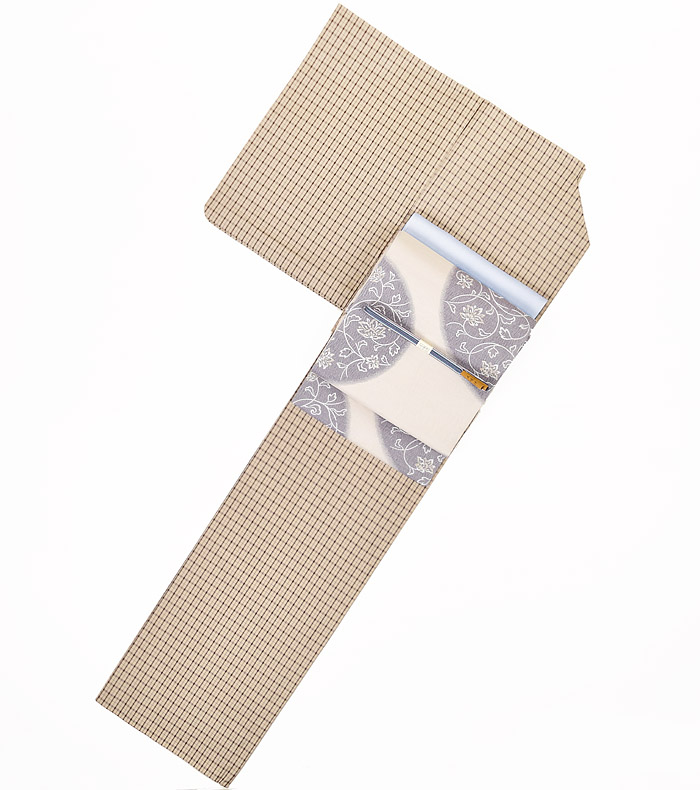 単衣:ライトグレーに涼しげな小格子柄の本塩沢で爽やかさを演出