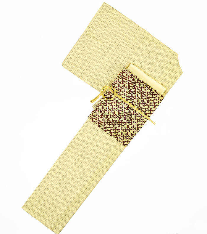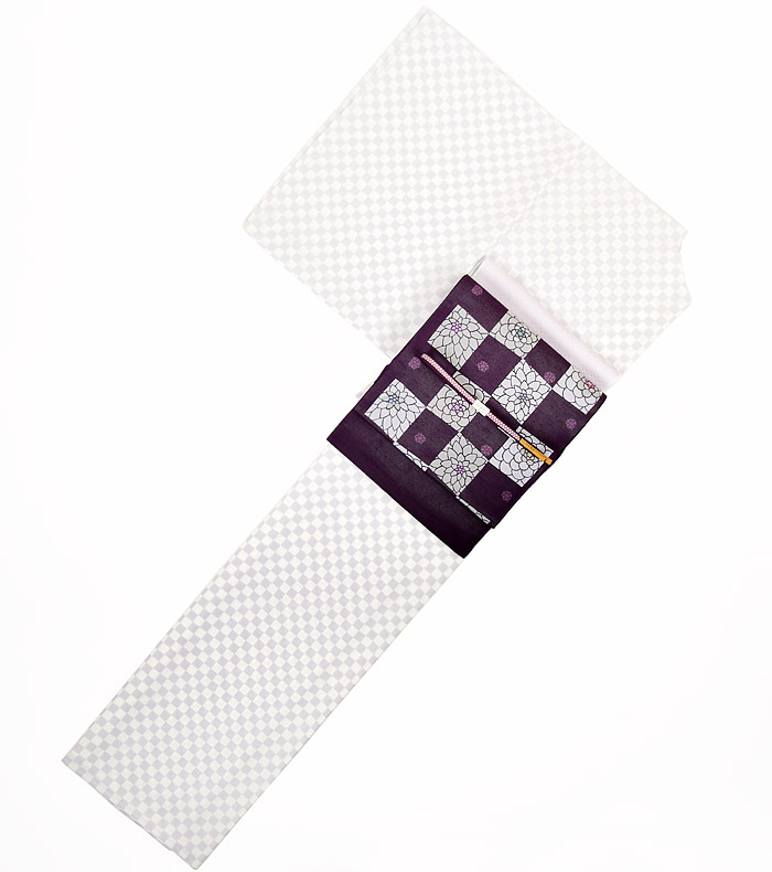 単衣:パステルカラーの市松デザインのおしゃれ小紋を帯でアレンジ
