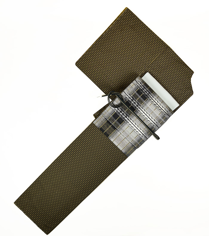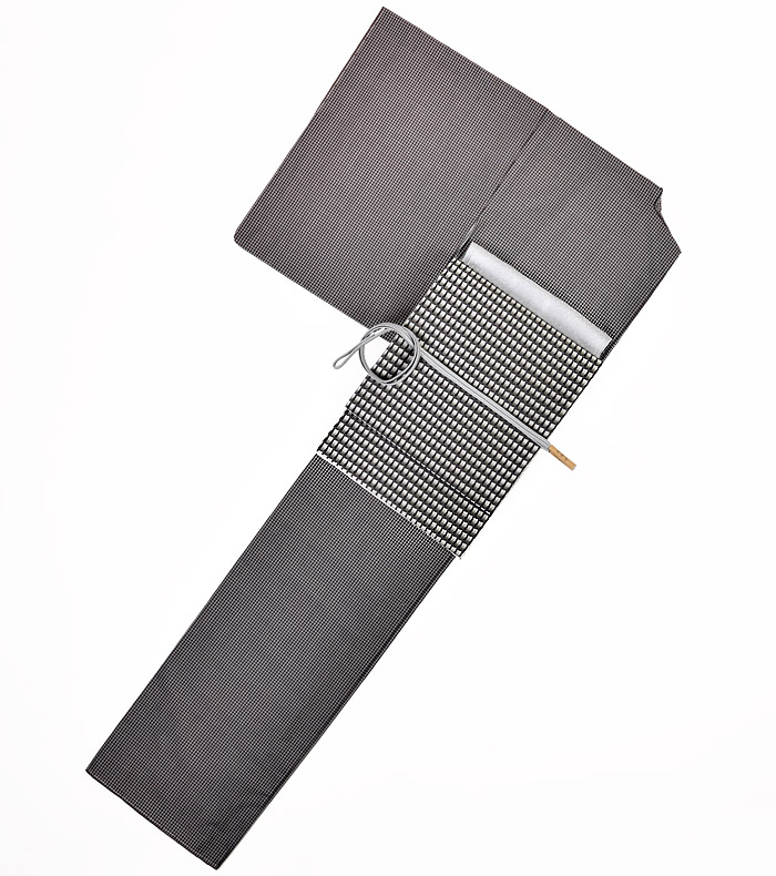 横段模様がすっきりと印象的なダークグレーの本塩沢でおしゃれを愉しむ