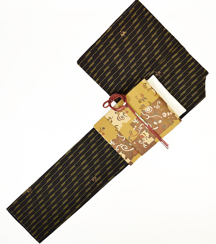 線文がすっきりとした印象を与えるオフブラックの大島紬コーデ