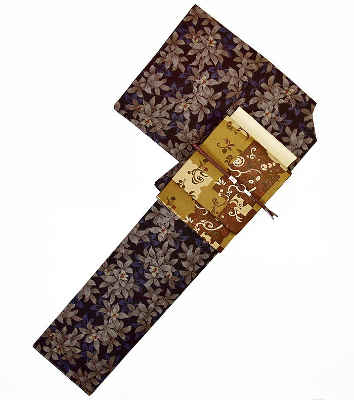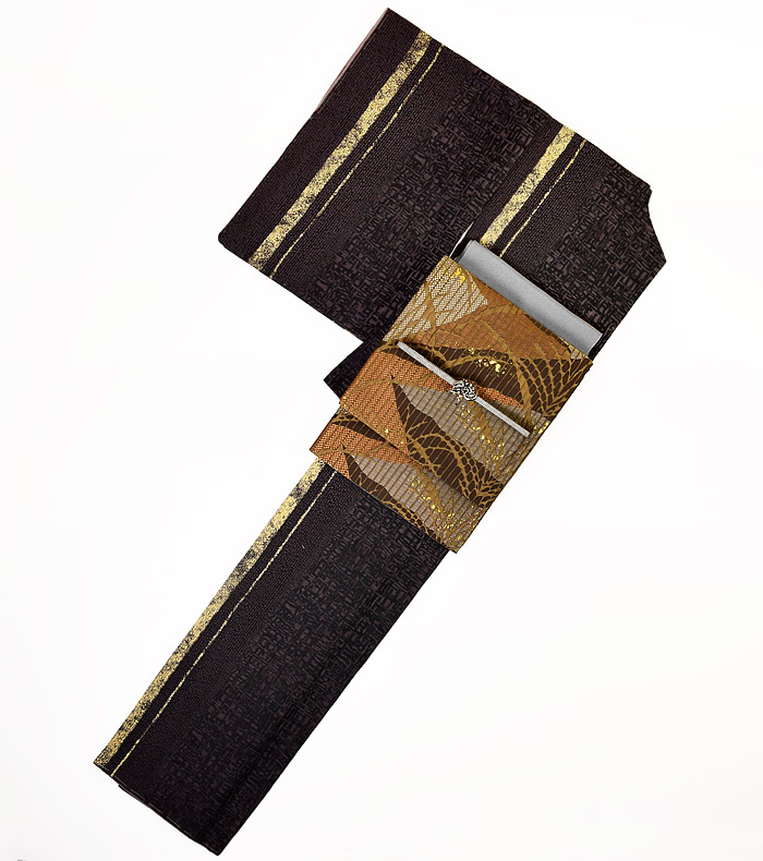 マットブラウンの塩沢御召に洒落袋帯を合せたモダンスタイル