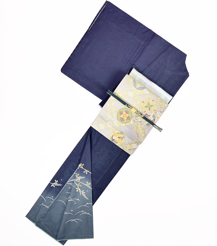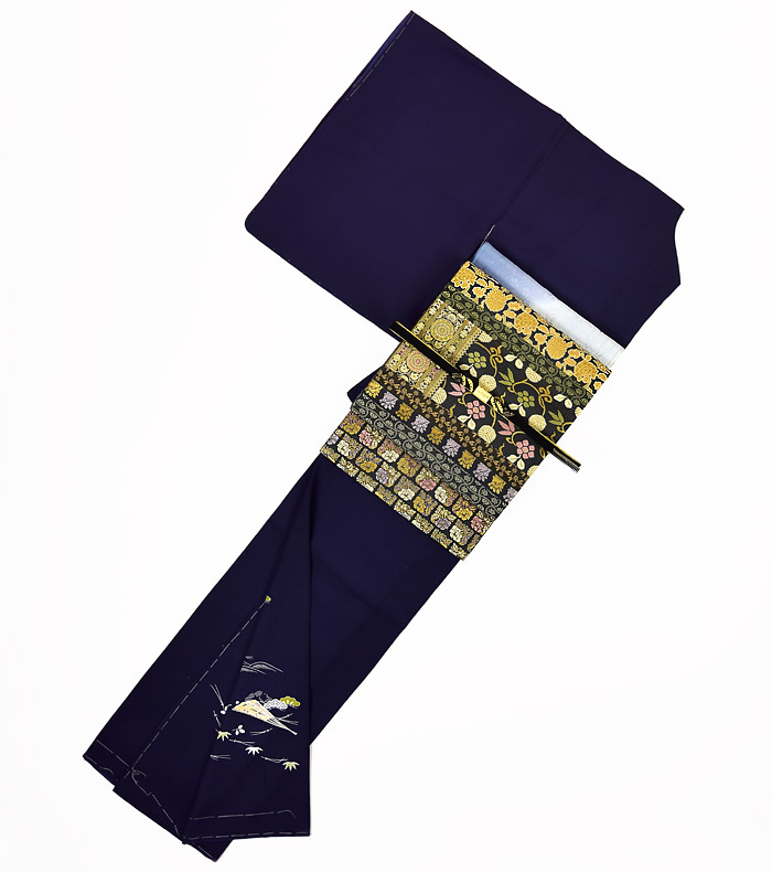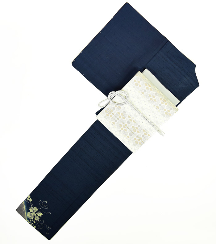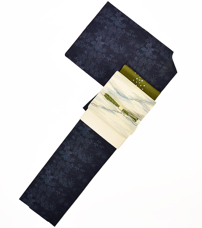 附下訪問着 濃紺 横段 四季花のコーディネイト