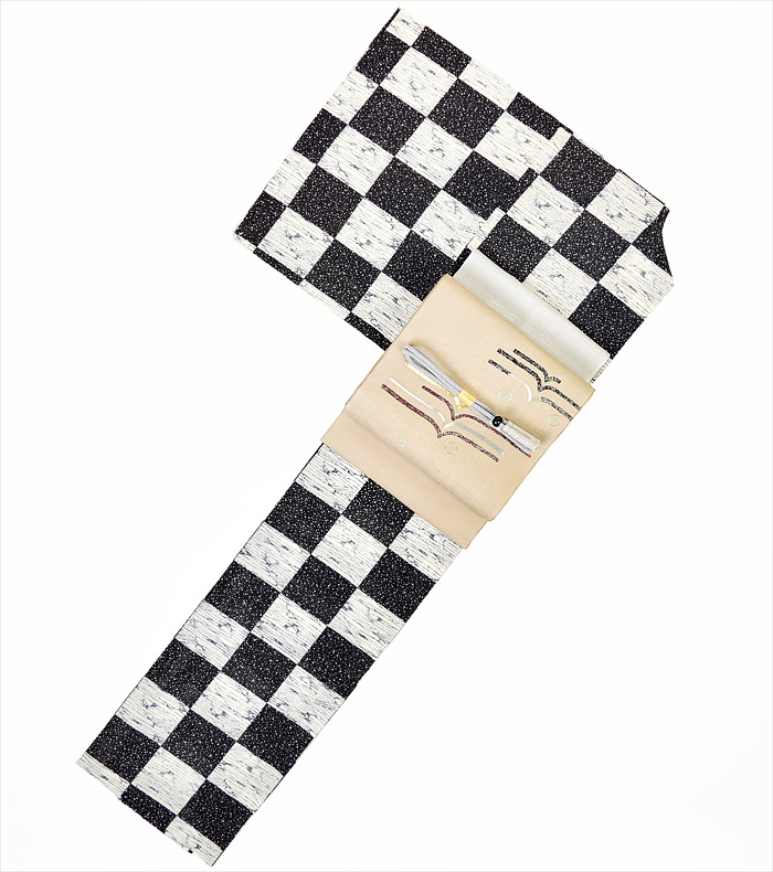 盛夏:白と黒の市松柄の絽の小紋に、貴女好みの帯をプラスして
