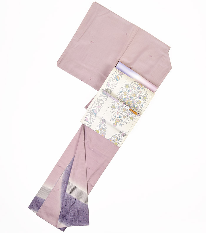 単衣:装い香るラベンダーカラーの小紋で、スッキリきれいめカジュアル。