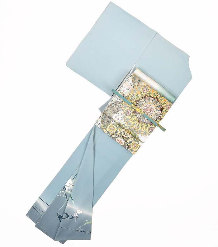紬 (裾濃附下)ライトブルー 友禅花文のコーディネート